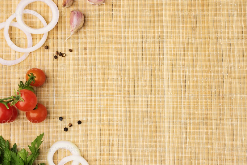 Сырые помидоры, травы, черный перец и лук, на деревянных фоне. Вид сверху с копией пространства