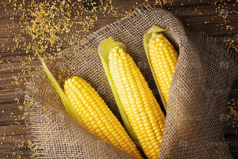 Зерна спелой кукурузы на деревянном фоне. Свежая кукуруза на початках на деревенском деревянном фоне в мешковине возле кукурузной крупы