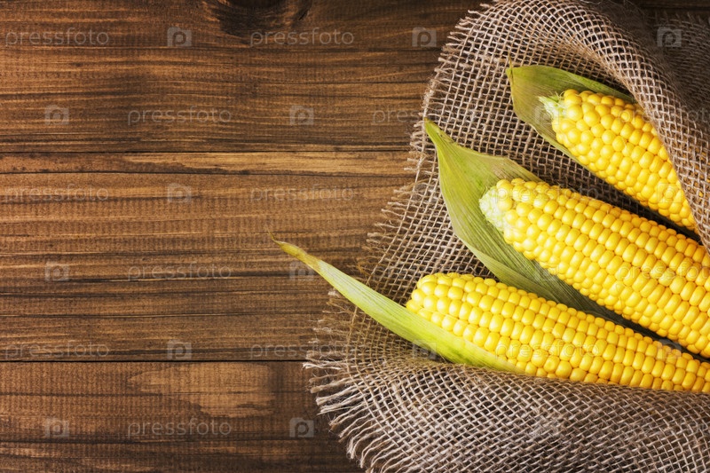 Зерна спелой кукурузы на деревянном фоне. Свежая кукуруза на початках на деревенском деревянном фоне в мешковине возле кукурузной крупы