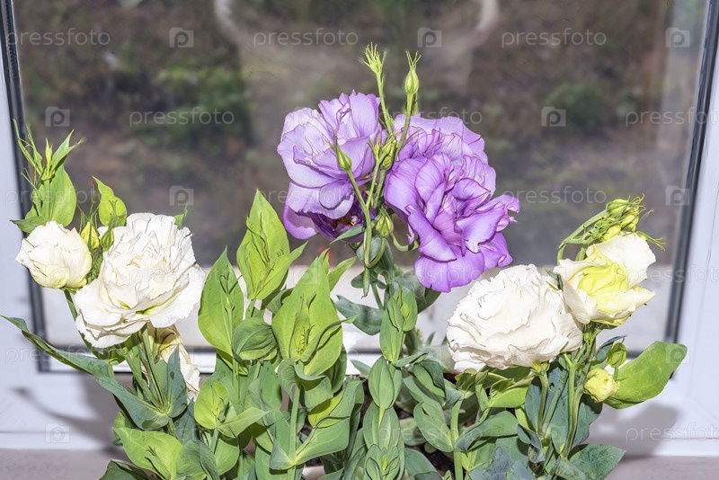 Крупный план сиреневых и белых цветов эустомы и нераспустившихся бутонов на зеленых стеблях у окна