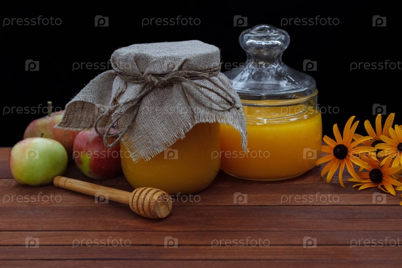 Мед в стеклянной банке с льняной крышкой с букетом желтых ромашек и яблок стоит на коричневом деревянном кухонном столе рядом с ложкой для меда на темном фоне