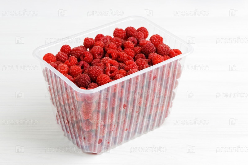 Свежая красная малина в пластиковой коробке на белом деревянном столе