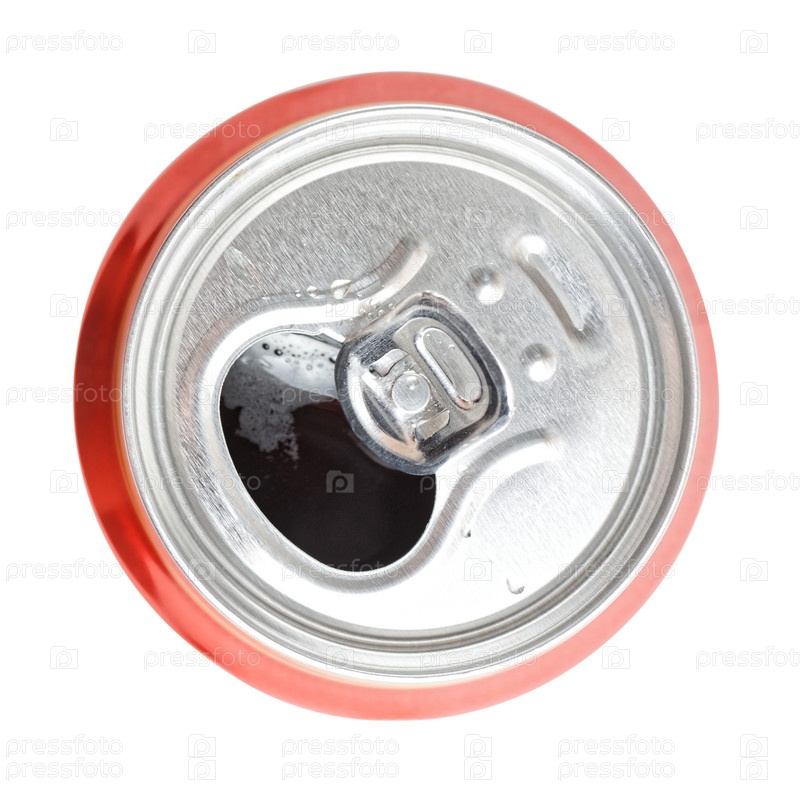 Открытая алюминиевая банка с пивом или содовой. Вид сверху. Изолированные на белом фоне
