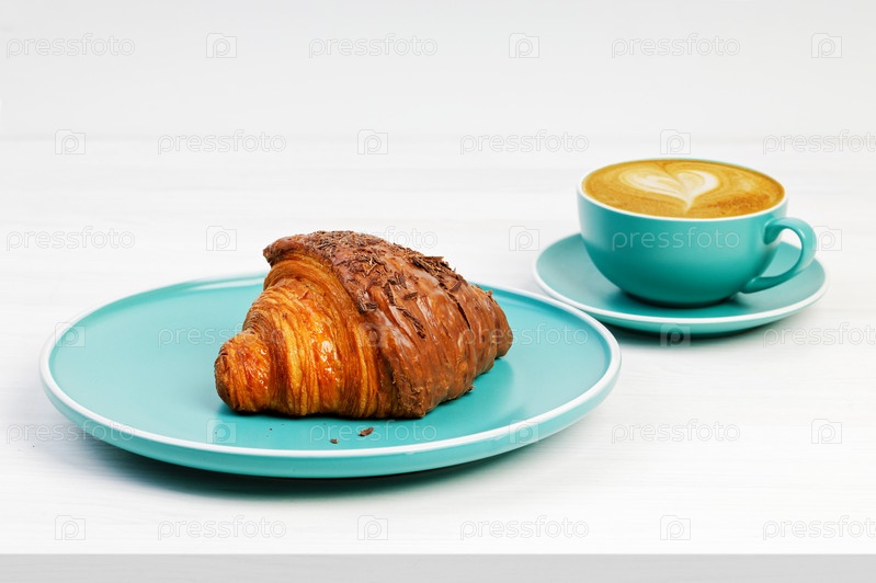 Круассан с шоколадом и капучино чашки кофе на белом деревянном столе