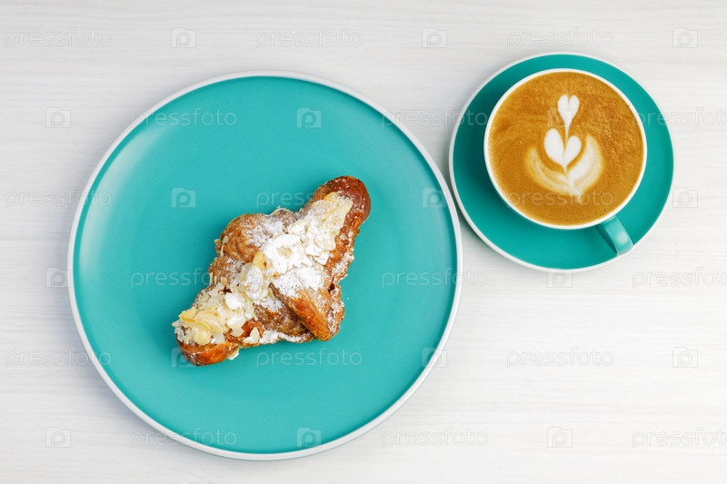 Круассан и чашка кофе капучино на белом деревянном столе. Вид сверху