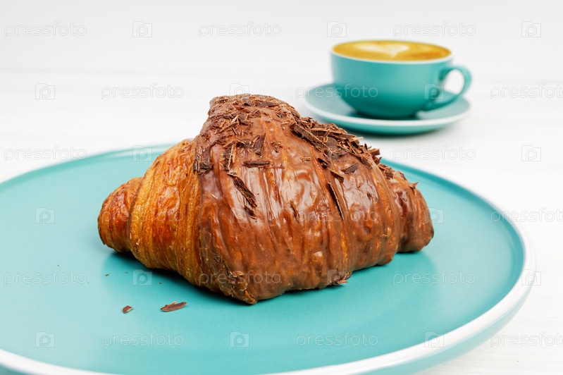Круассан крупного плана с шоколадом и чашкой капучино кофе на белом деревянном столе Взгляд сверху. Мелкий фокус