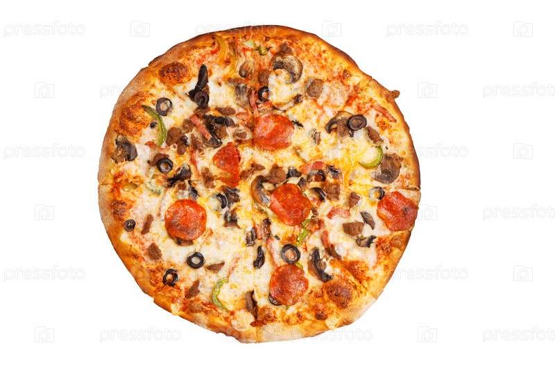 Пицца с пепперони, мясным фаршем, грибами, сладким перцем и оливками, изолированными на белом. Вид сверху