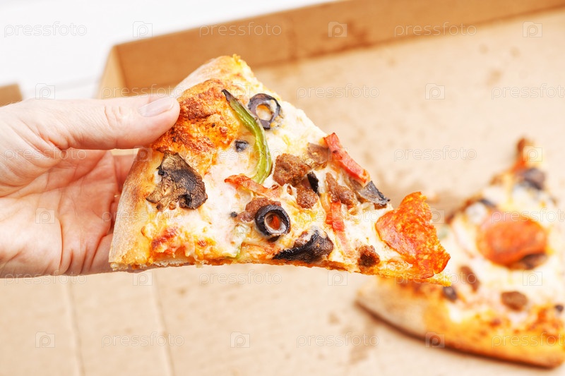 Крупный план итальянской пиццы с пепперони, мясным фаршем, грибами, сладким перцем и оливками в руке и открытой коробкой с остатками пиццы на размытом фоне. Мелкий фокус