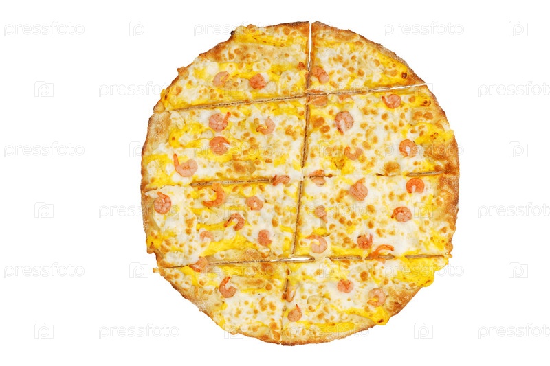 Пицца креветок морепродуктов крупного плана изолированная на белизне. Вид сверху