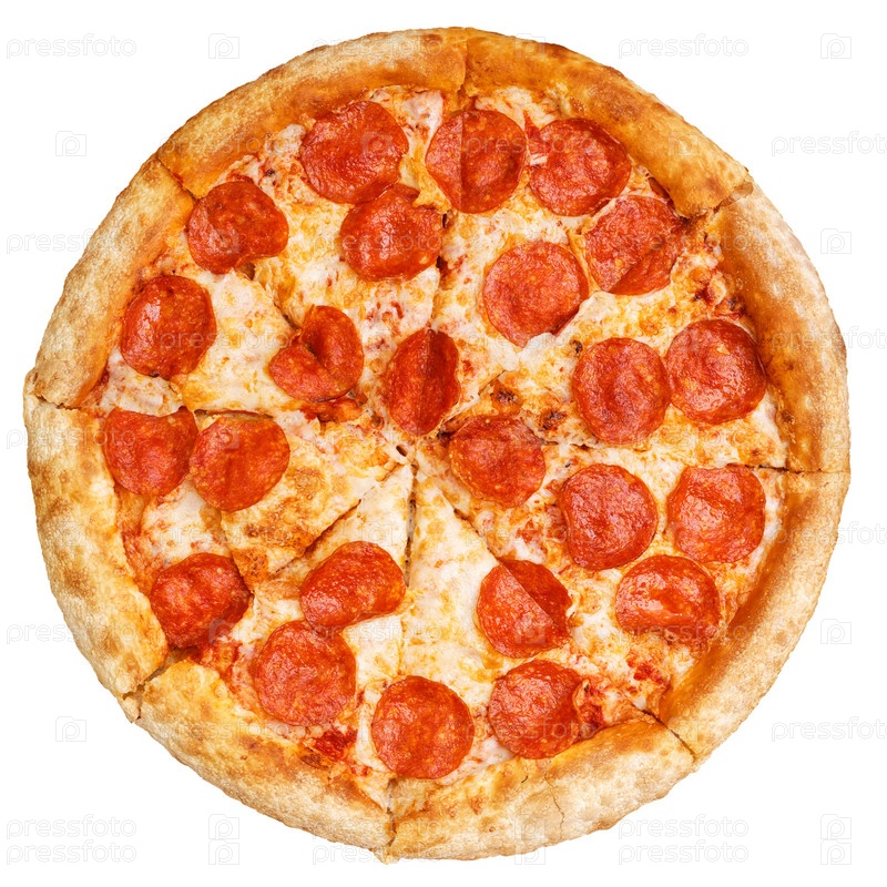 Вкусная итальянская классическая оригинальная пицца пепперони. Вид сверху. Изолированные на белом фоне