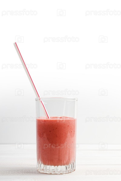 Клубнично-банановый смузи в прозрачном стакане на белом деревянном столе. Копипространство