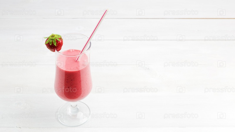 Клубнично-банановый смузи в прозрачном стакане на белом деревянном столе. Копипространство