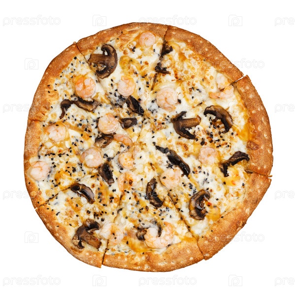 Пицца крупного плана с грибами и креветками изолированными на белизне. Вид сверху