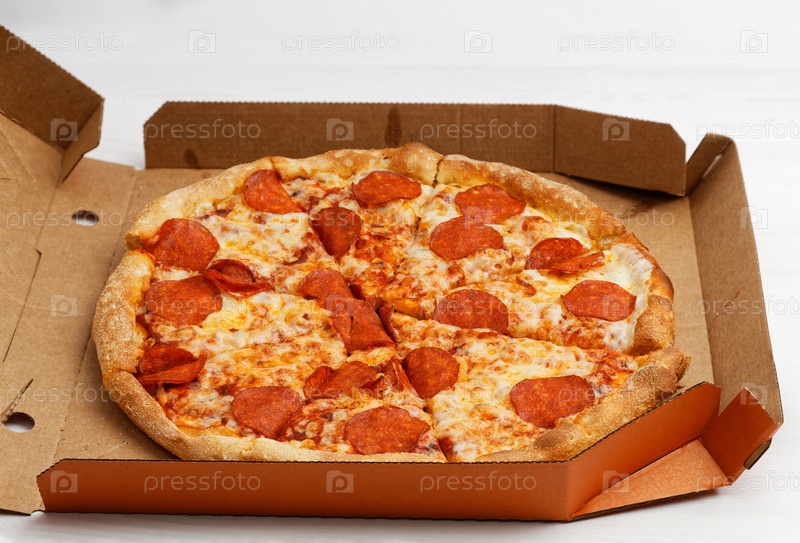 Коробка крупного плана открытая с пиццей пепперони на белом деревянном столе