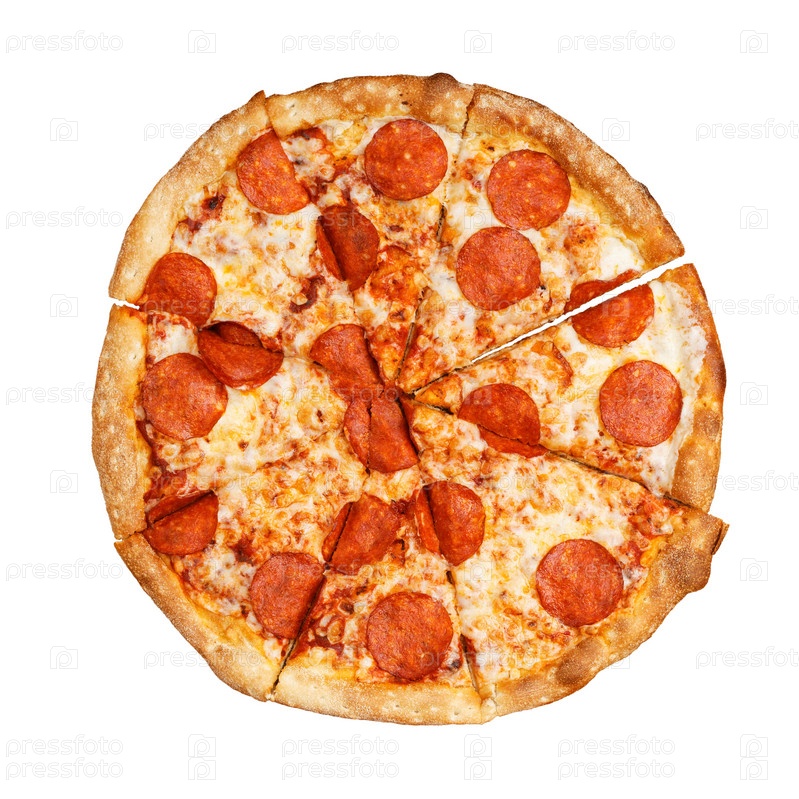 Пицца крупным планом с пепперони. Вид сверху. Изолированные на белом фоне