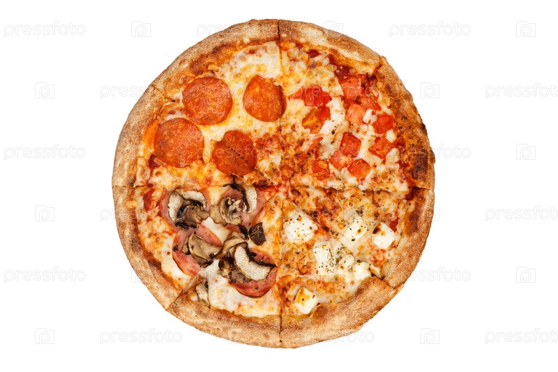Смешанная мясная и овощная пицца, изолированная на белом. Вид сверху
