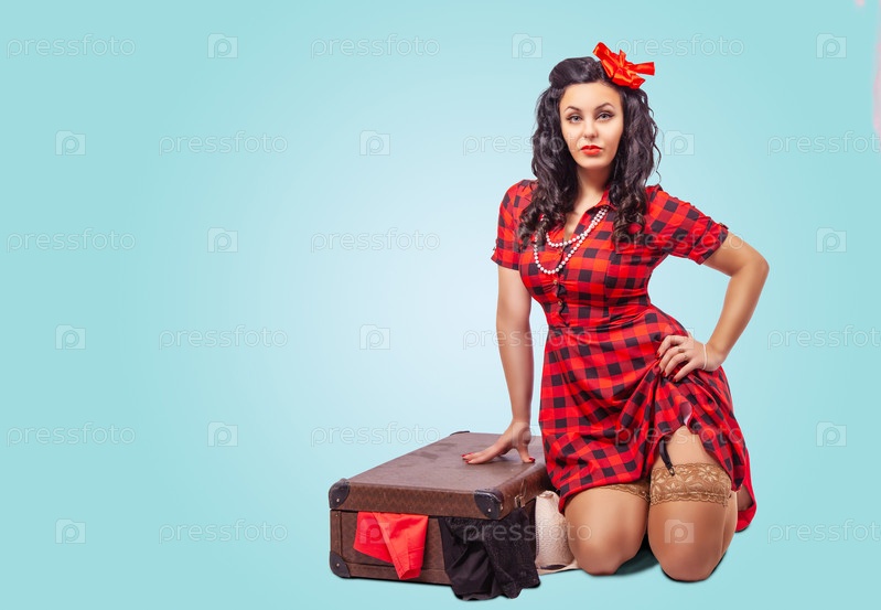 Молодая женщина сидит на полу и кладет одежду в чемодан