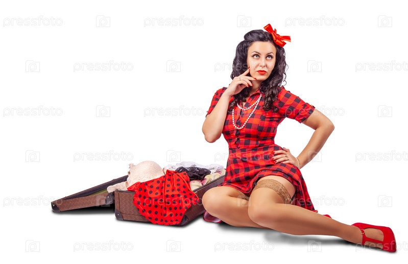 Молодая женщина сидит на полу и кладет одежду в чемодан
