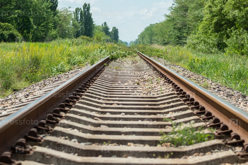 Ветка железной дороги уходит далеко в зеленую траву. Тропа проходит между деревьями. Концепция железной дороги