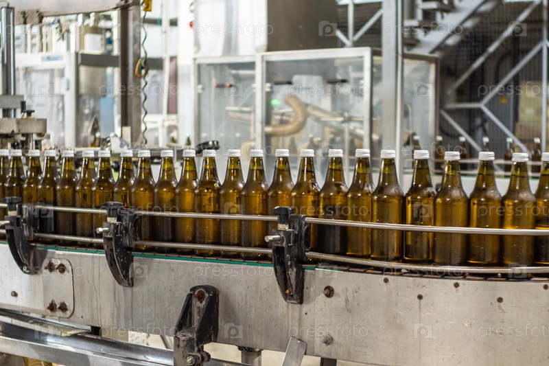 Коричневые 0,5-литровые стеклянные бутылки с питьевой водой на конвейере в производственном цеху