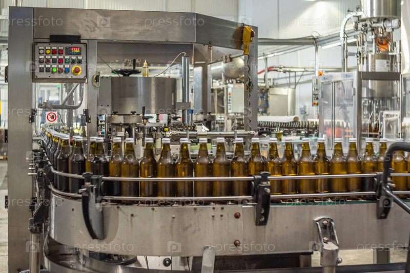Бутылки из коричневого стекла с питьевой водой на конвейерной ленте перемещаются в этикетировочную машину