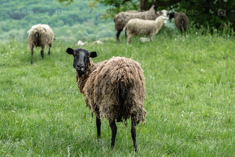 Любопытная черная овца с грязными волосами смотрит в камеру. Пастбище в горах. Зеленая трава и другие овцы на заднем плане. Концепция животноводства