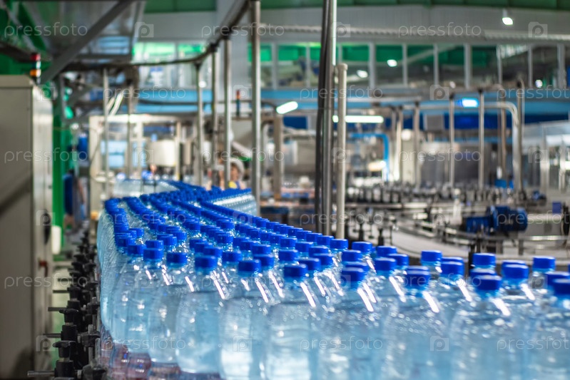 Синие пластиковые бутылки в три ряда с чистой питьевой водой на конвейерной ленте на заводе минеральной воды. Производство продуктов питания