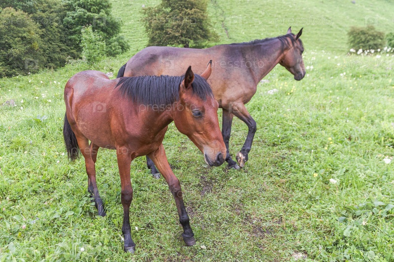 Две темно-коричневые лошади на фоне зеленой травы. Концепция животноводства