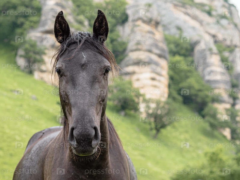 Крупный план головы коричневой лошади, смотрящей в кадр. На фоне горы и зеленой травы. Понятие животноводства