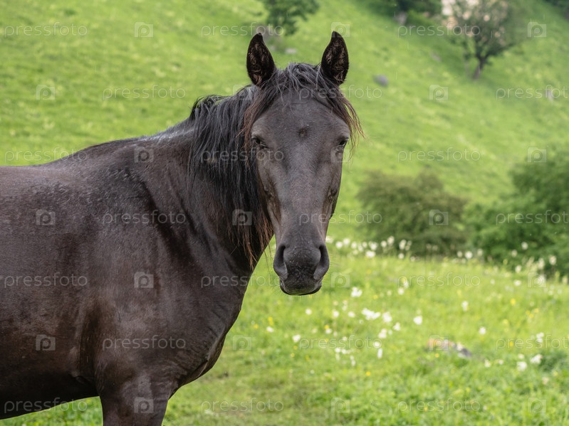 Коричневая лошадь боком. Голова повернута к камере. Зеленая трава на заднем плане. Концепция разведения крупного рогатого скота
