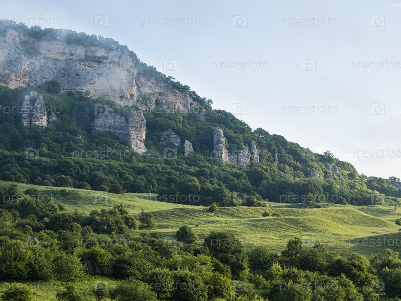 На фоне небольших зеленых деревьев возвышается могучая гора с отвесными скалами. Над ним голубое небо. Утренний пейзаж