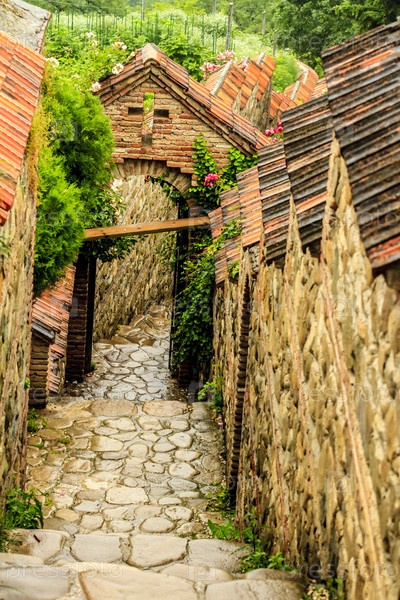 Каменные лестницы и каменная арка после дождя. Монастырь Святой Нино в Бодбе, Грузия