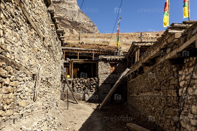 Узкая улица в Мананге - горной деревне в Непале. Гималаи, заповедник Аннапурны