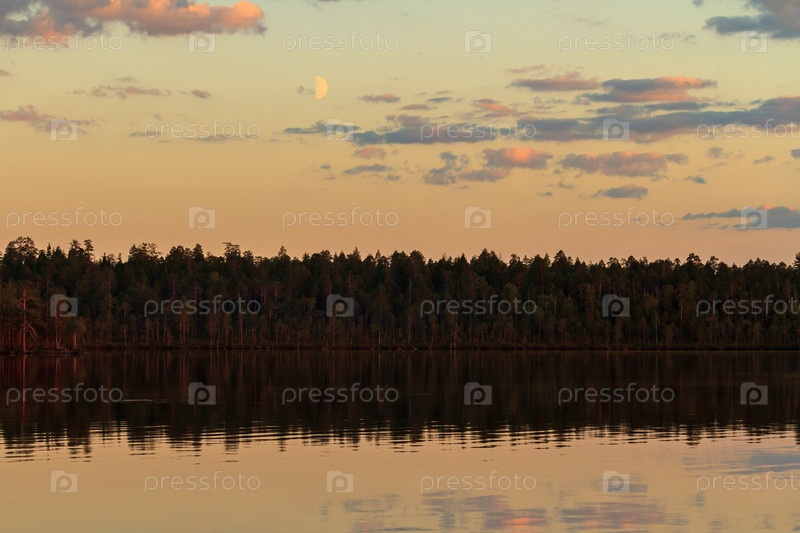 Луна над темным ночным лесом у озера. Мистический фантастический сказочный образ