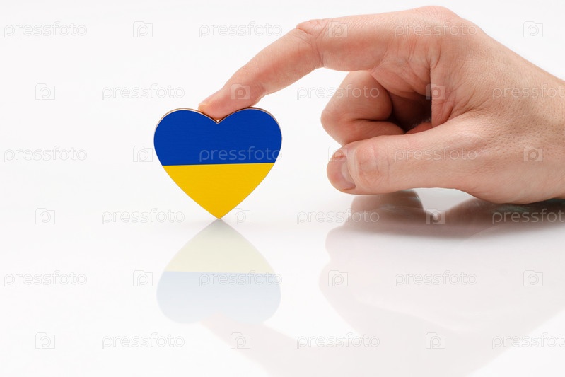 Любите и уважайте Украину. Мужская рука держит сердце в форме украинского флага на поверхности белого стекла. Концепция украинского патриотизма и гордости