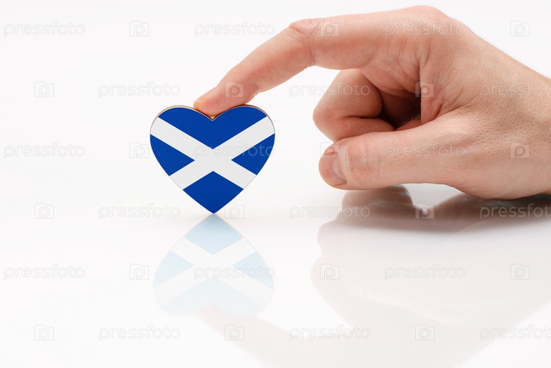 Любите и уважайте Шотландию. Мужская рука держит сердце в форме флага Шотландии на поверхности белого стекла. Шотландский патриотизм и гордость