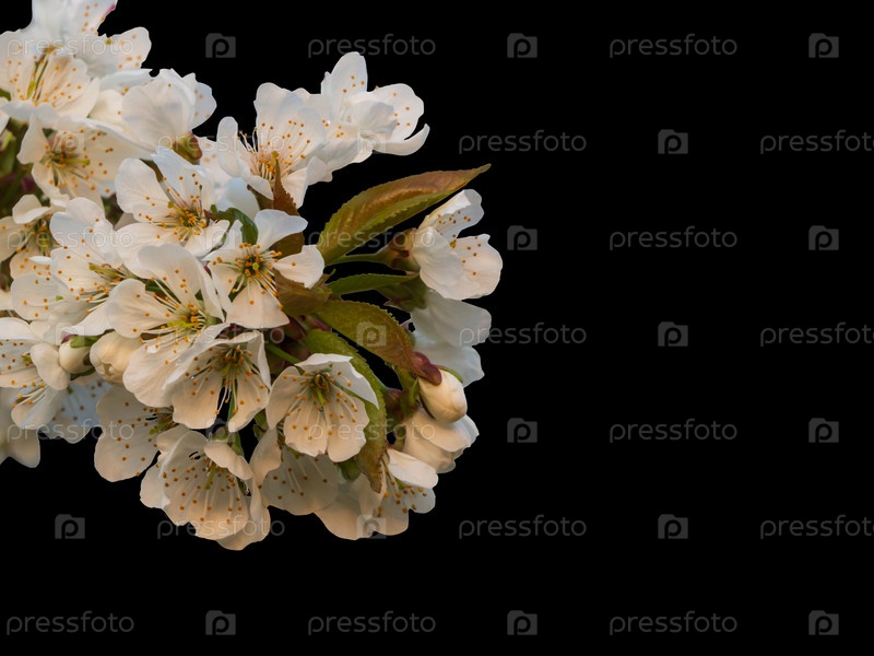 Крупный план ветки сакуры, изолированной на черном. Деревья цветут весной. Нежные лепестки вишневого цвета для дизайна. Граница весенних вишневых цветов. фруктовый сад