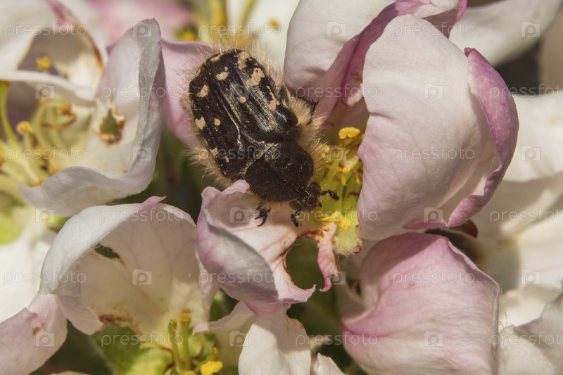 Бронзовый пушистый жук питается цветом яблоня. Фото макроса цвета жука. Пушистая бронзовка (Tropinota hirta) - вредитель, уничтожает цветы плодовых деревьев, снижает урожай фруктов
