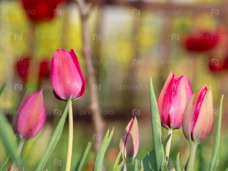 Элегантные голландские темно-розовые тюльпаны весной на клумбе с размытым фоном. Красочные тюльпаны в весеннем саду