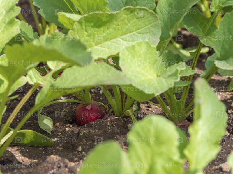 Крупный план красной редьки, растущей в земле на грядке. Экологически чистая домашняя еда. Весенний первый урожай. Спелая красная редька