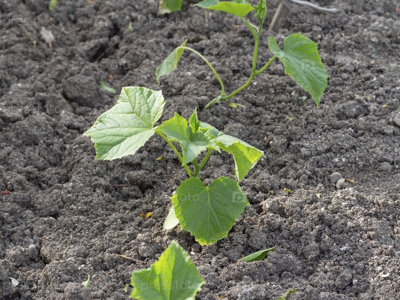 Крупный план рассады зеленого огурца в саду. Рассада огурцов на грядке в открытом грунте