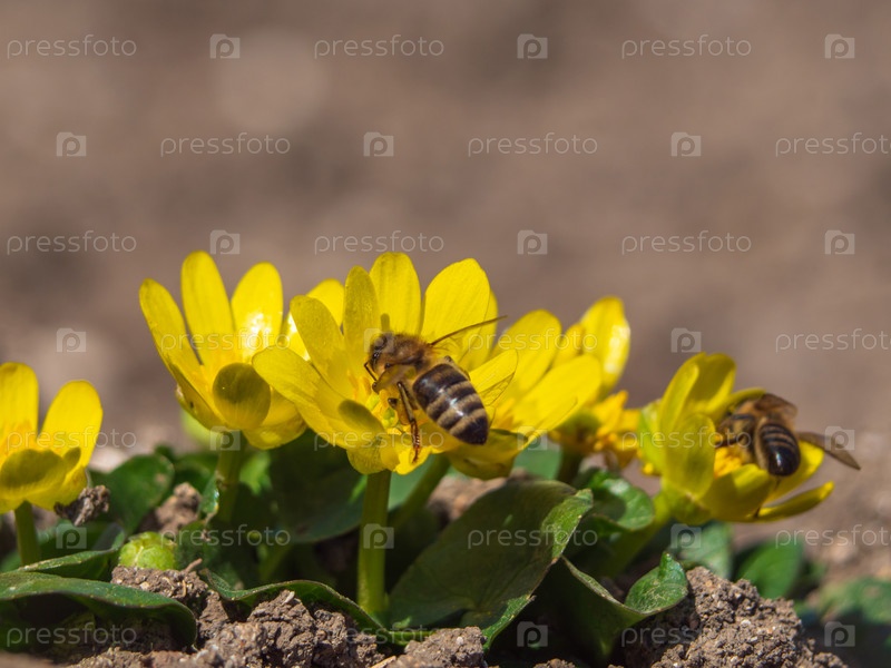 Пчелы собирают нектар с первых весенних цветов на открытом воздухе в парке. Пчела сидит на желтом цветке ранней весной
