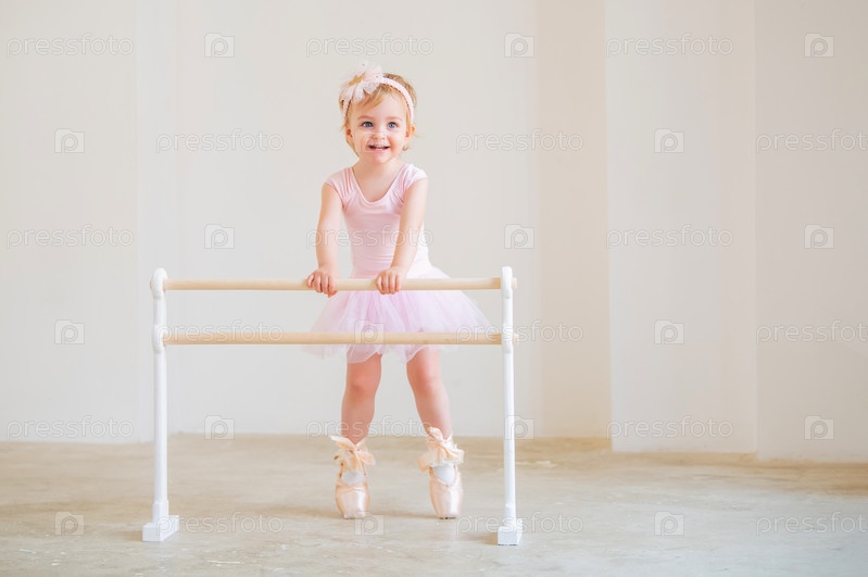 Портрет милой голубоглазой балерины в розовом трико и больших пуантах, стоящих возле балетного станка