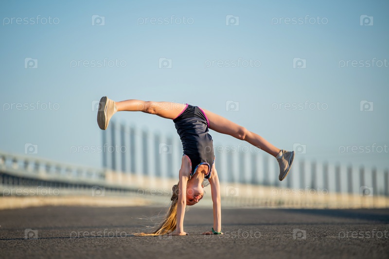 Девушки тренируются летом на улице, стоят на руках, ноги в шпагате