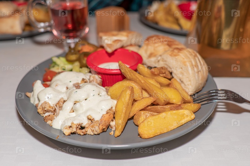Жареное куриное мясо с картофелем фри и свежими овощами на тарелке