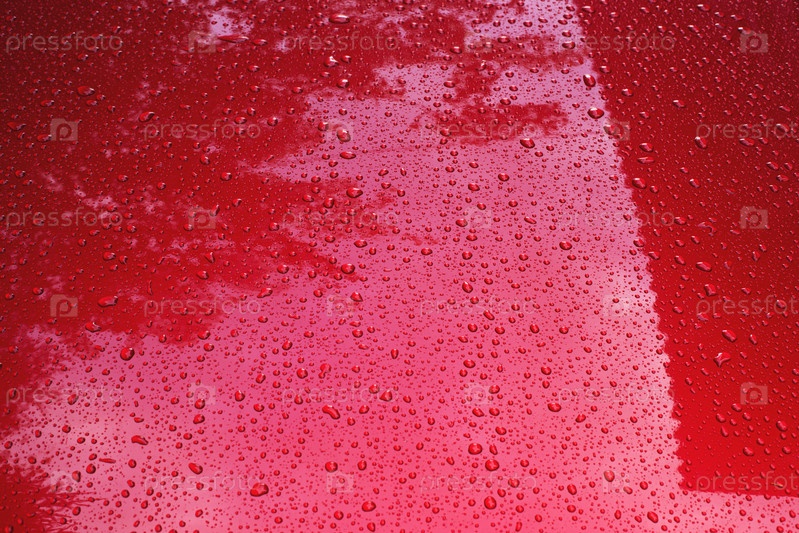 Абстрактный красный фон с каплями воды на поверхности капота автомобиля