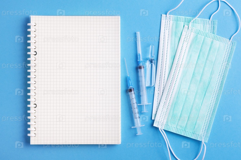 Макет с пустой клетчатой страницей и лекарствами на синем фоне