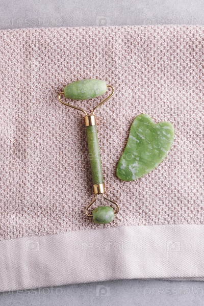 Нефритовый зеленый ролик и массажный камень гуаша на хлопковом бежевом полотенце