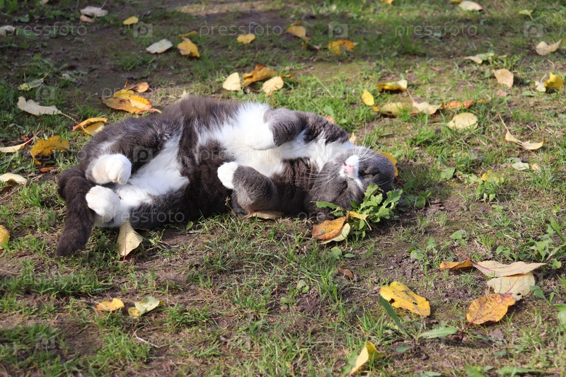 Серый кот лежит на траве с поджатыми лапами