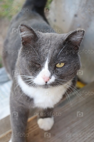 Серый кот смотрит в камеру и подмигивает